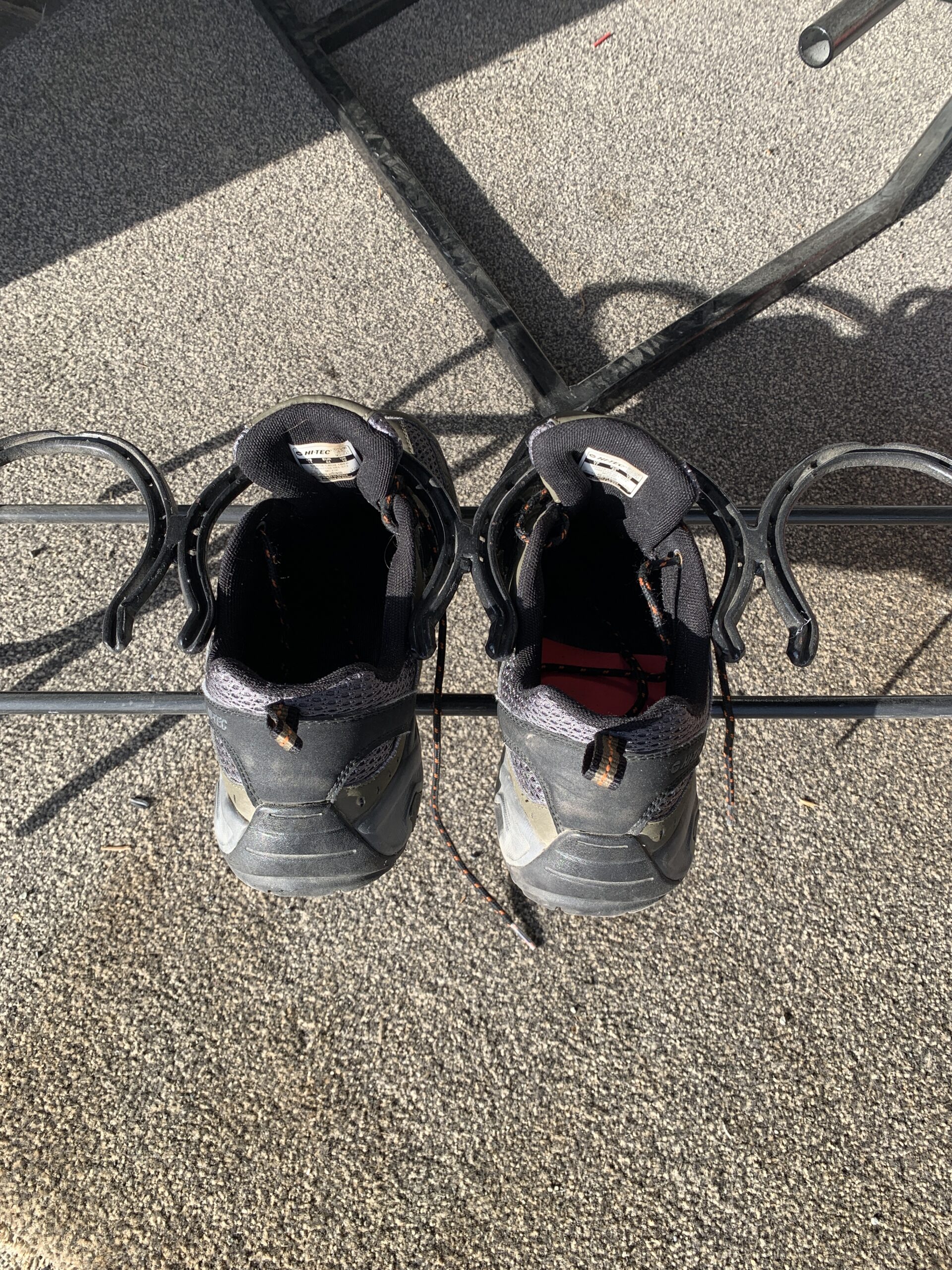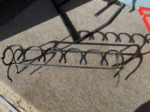Novelty shoe rack constructed from horseshoes welded together.