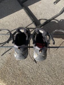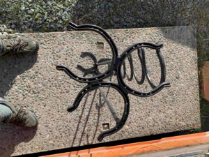Novelty shoe rack made from horseshoes.